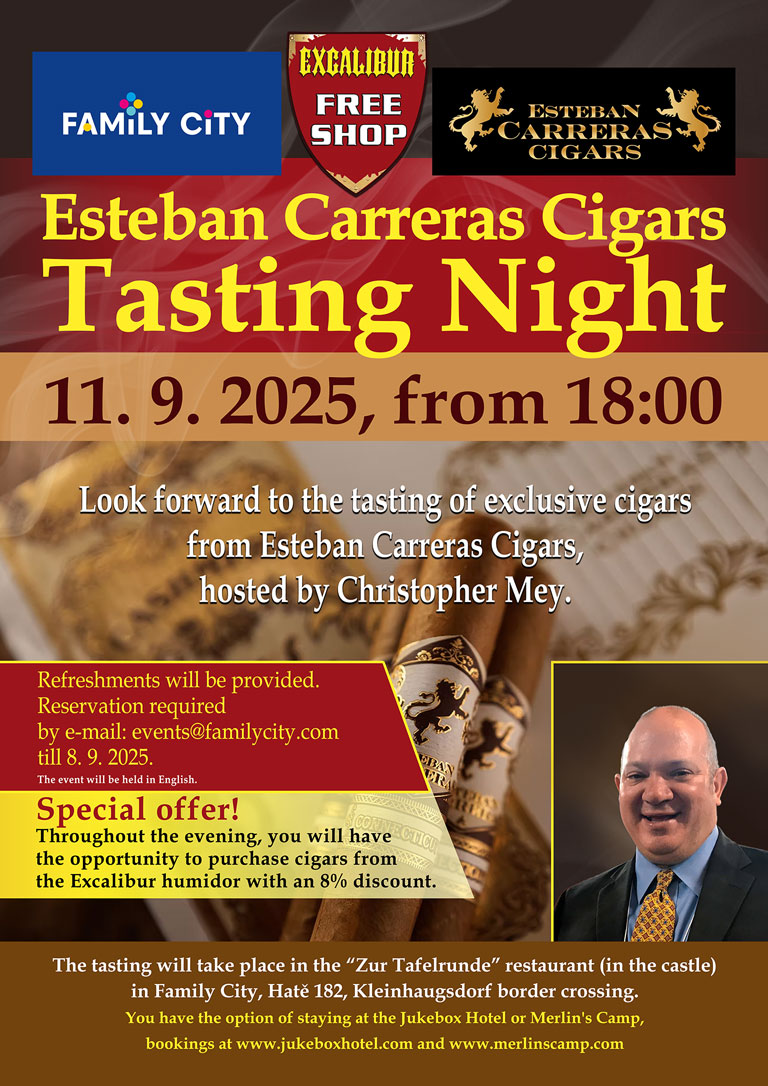 Čtvrtek 11. Zář 2025Ve čtvrtek 11. září jsme měli tu čest uspořádat výjimečný večer zasvěcený milovníkům kvalitních doutníků. Hlavní roli večera hrály doutníky značky Esteban Carreras Cigars, které si hosté mohli nejen vychutnat, ale také se o nich dozvědět mnoho zajímavého přímo od zdroje. Celým večerem nás provedl Christopher Mey, majitel společnosti Christopher Mey Premium Cigars, který přiletěl osobně představit svou značku a její příběh. Jeho poutavé vyprávění o původu tabáku, filozofii výroby a jedinečných směsích doplnilo celý zážitek o rozměr, který nelze zprostředkovat jen samotným kouřením.